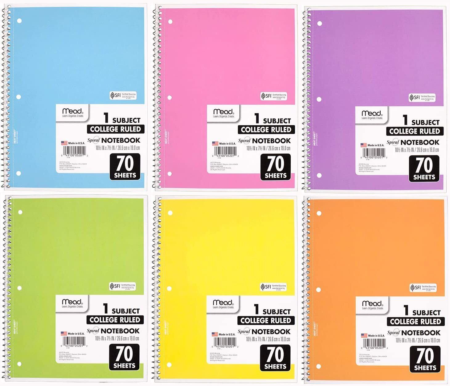 Mead Spiral Notebook 6 Pack of 1-Subject College Ruled Spiral Bound Notebooks 70 Sheets