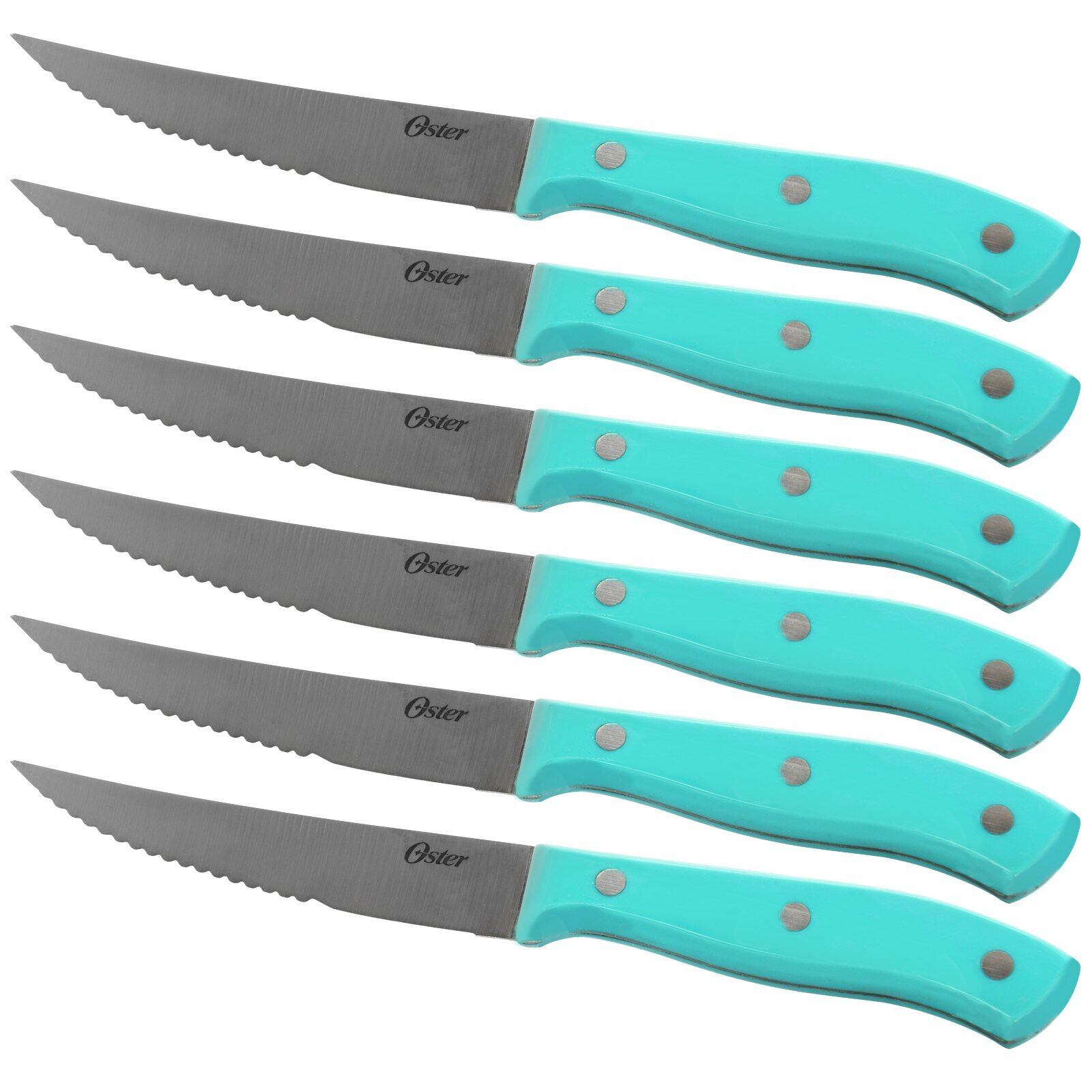 Oster Evansvilleのカトラリーセットは、14本の包丁とナイフがセットになった優れものです。ステンレススチール製の刃は、耐久性に優れ、長く使えます。ターコイズのハンドルがカラフルでモダンな印象を与え、キッチンを華やかに演出します。